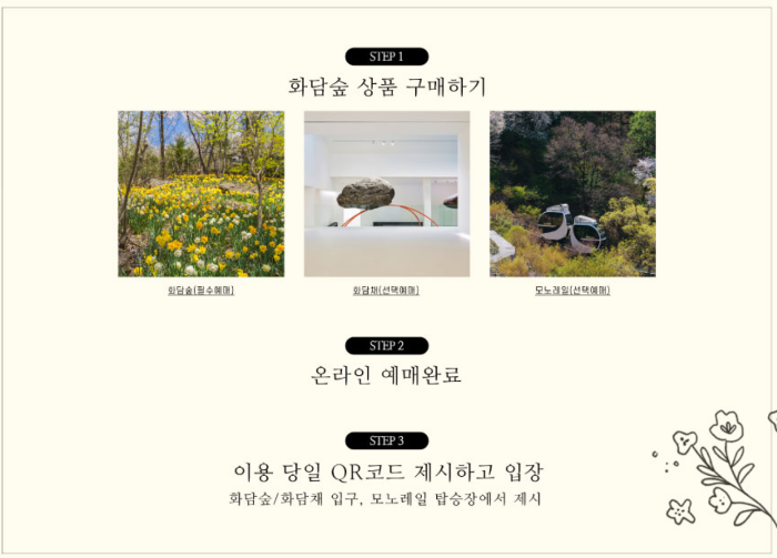 야놀자 회원가입 및 로그인 필수 입장권(필수) → 화담채(선택) → 모노레일(선택) 순서로 구매 가능 예약 후 QR코드 발급 → 당일 현장에서 제시 후 입장