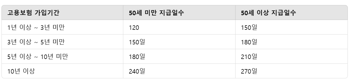✔️ 최대 지급 기간: 120일 ~ 270일 (연령 및 가입기간에 따라 다름)